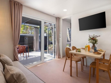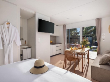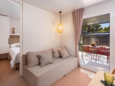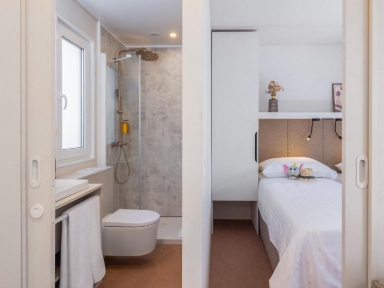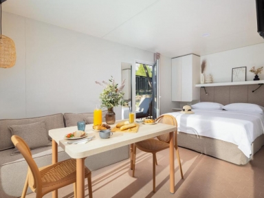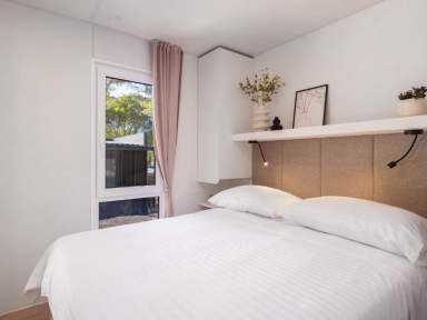 • COMFORT HOLIDAY HOME 4+1: prib. 32 m2, 2 spalnici (ena z zakonsko posteljo, druga z ločenima ležiščema), 2 kopalnici (prha/WC), kuhinjska niša in dnevni prostor (dodatno ležišče kavč na razteg 150x185 cm za otroka do 12 let), nadkrita terasa z vrtno garnituro.