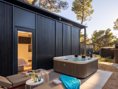 PREMIUM ESCAPE 4+1 (JACUZZI): prib. 32 m2, 2 spalnici (ena z zakonsko posteljo, druga z ločenima ležiščema), 2 kopalnici (prha/WC), kuhinjska niša in dnevni prostor (dodatno ležišče kavč na razteg 150x185 cm za otroka do 12 let), nadkrita terasa z vrtno garnituro. Jacuzzi.