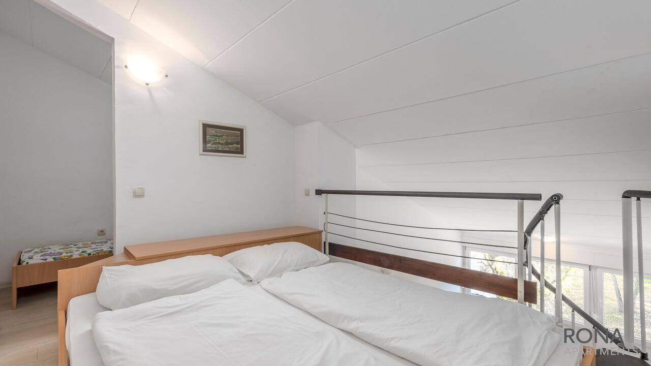 APP 4+2: prib. 44 m2, spalnica s francosko posteljo, v galeriji nad spalnico se nahaja še ena francoska postelja za 2 osebi, dnevni prostor z raztegljivim ležiščem za 2 osebi, kuhinja z jedilnim kotom, kopalnica (prha/WC).
