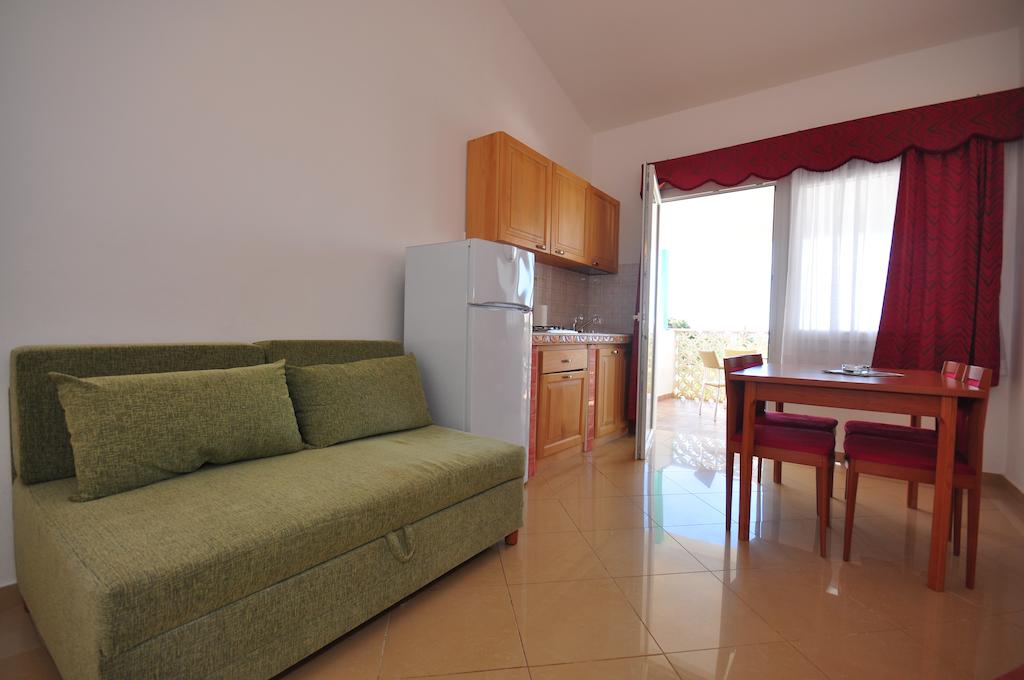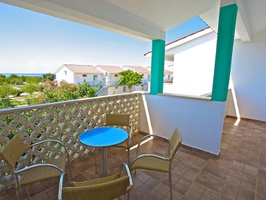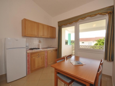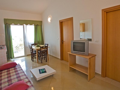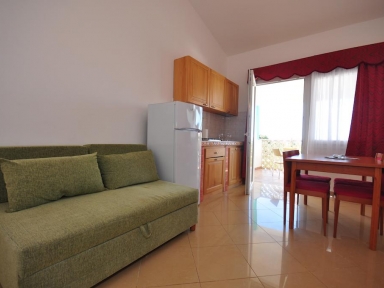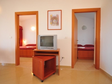 1/4+1 APP AC (A4-5): prib. 45 m2; kuhinja in dnevni prostor z raztegljivim kavčem za 1 osebo, 2 spalnici, kopalnica (prha/WC), balkon/terasa.