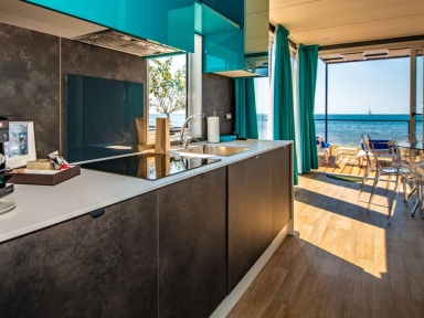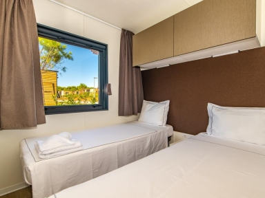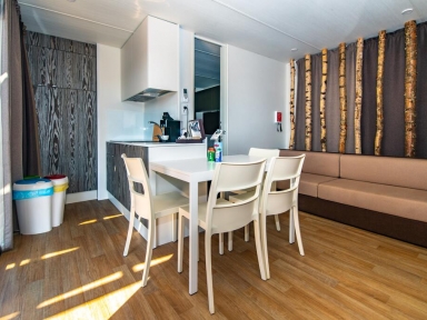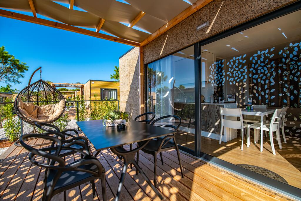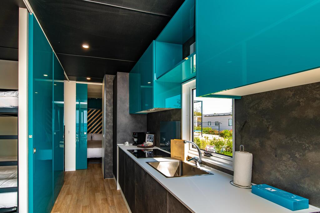 MH 1/6 PREMIUM: prib. 33 m2 + terasa 15 m², kuhinja (pomivalni stroj, hladilnik z zamrzovalnim delom, opekač kruha, grelnik za vodo) in dnevni prostor, 3 spalnice (ena z zakonsko posteljo, drugi dve z ločenima ležiščema), kopalnica in ločen WC. Največ 6 oseb. Dodatno: električni žar/ plancha. Novejše hišice, postavljene 2022.