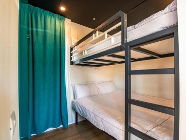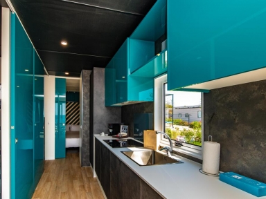 MH 4+1 GREEN: 37 m² + terasa 25 m², kuhinja in dnevni prostor s kavčem za 1 osebo, 2 spalnici (ena z zakonsko posteljo, druga z ločenima ležiščema), 2 kopalnici (prha/WC). Zgrajene iz ekoloških materialov. Največ 5 oseb.