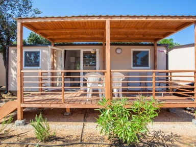 MOBILNE HIŠICE: opremljene s klimo, SAT TV, vrtno garnituro na terasi. Parkirišče. Od morja oddaljene do 100 m.