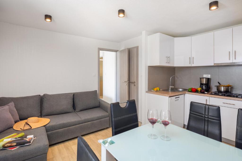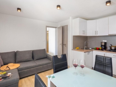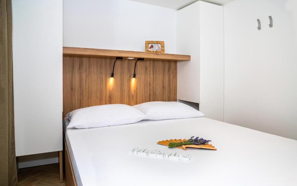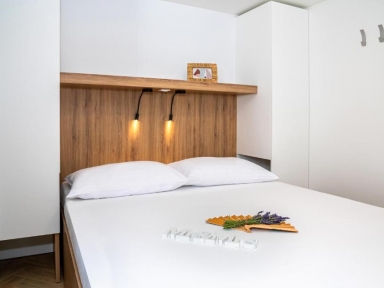 - Mobile home Relax 6+2 (3rd/4th line from the beach): prib. 40 m2; 3 spalnice (ena z zakonsko posteljo, drugi dve z ločenima ležiščema), kuhinjska niša (pomivalni stroj) in dnevni prostor s kotnim kavčem 130x195 cm, 2 kopalnici (prha/WC). Nahajajo se v 3. In 4. vrsti od morja.