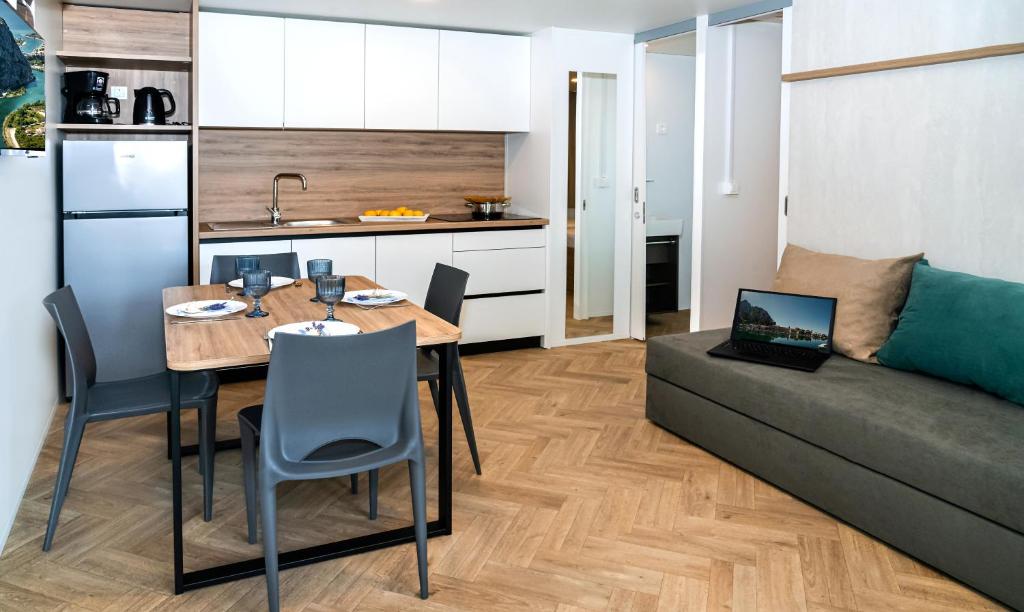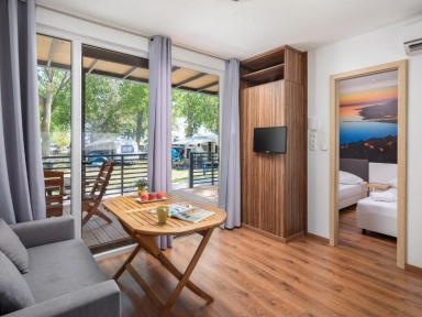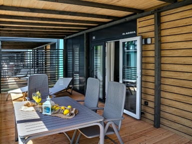 - Mobile home Adria superior 4+1 (C): prib. 34 m2; 2 spalnici (ena z zakonsko posteljo, druga z ločenima ležiščema), kuhinjska niša in dnevni prostor s kotnim kavčem 130x185 cm, 2 kopalnici (prha/WC). Od plaže oddaljene prib. 150 m.