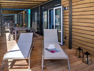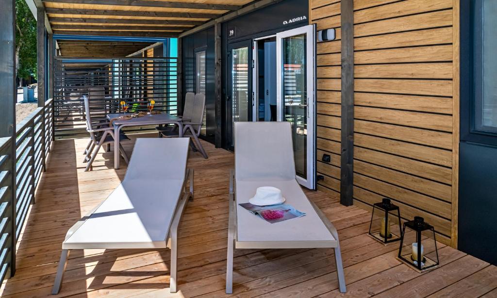 - Mobile home Relax 6+2 premium 2nd line – whirlpool: prib. 40 m2; 3 spalnice (ena z zakonsko posteljo, drugi dve z ločenima ležiščema), kuhinjska niša (pomivalni stroj) in dnevni prostor s kotnim kavčem 130x195 cm, 2 kopalnici (prha/WC). Nahajajo se v 2. vrsti od morja, prib. 20 m do plaže. Dodatno whirpool na terasi.