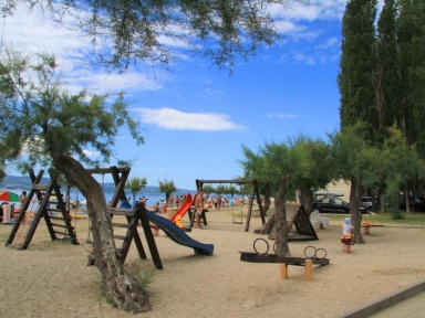 PLAŽA: 300 m dolga prodnato-peščena plaža, zelo primerna za družine z otroki. Možnost najema senčnikov in ležalnikov.