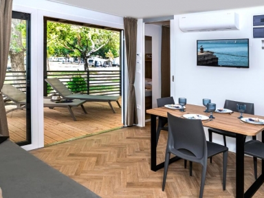 - Mobile home Sunshine 6+2 premium 1st line – whirlpool: prib. 40 m2; 3 spalnice (ena z zakonsko posteljo, drugi dve z ločenima ležiščema), kuhinjska niša (pomivalni stroj) in dnevni prostor s kotnim kavčem 130x195 cm, 2 kopalnici (prha/WC). Dodatno whirpool na terasi. Prva vrsta od morja.