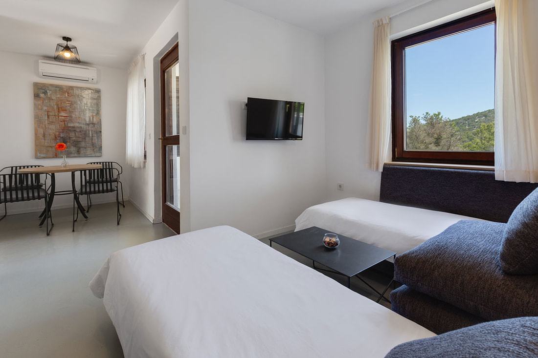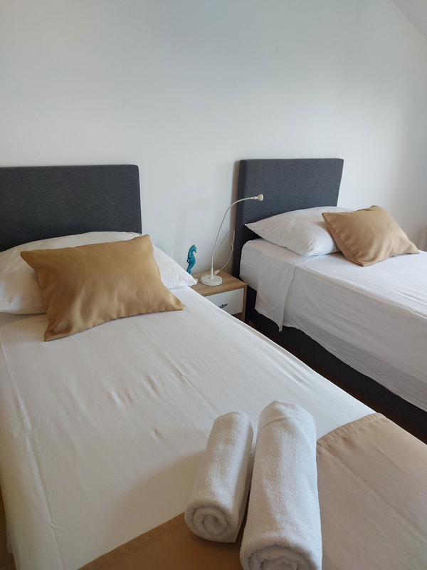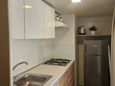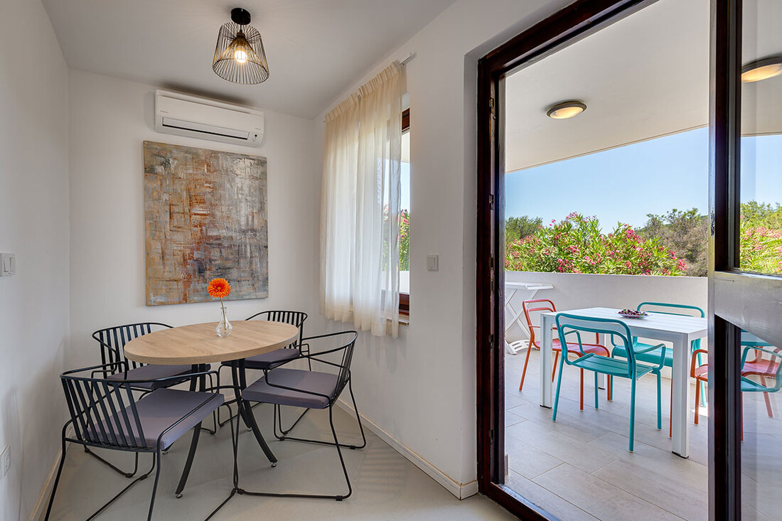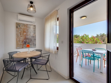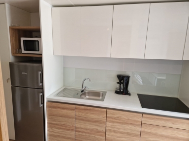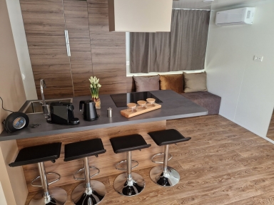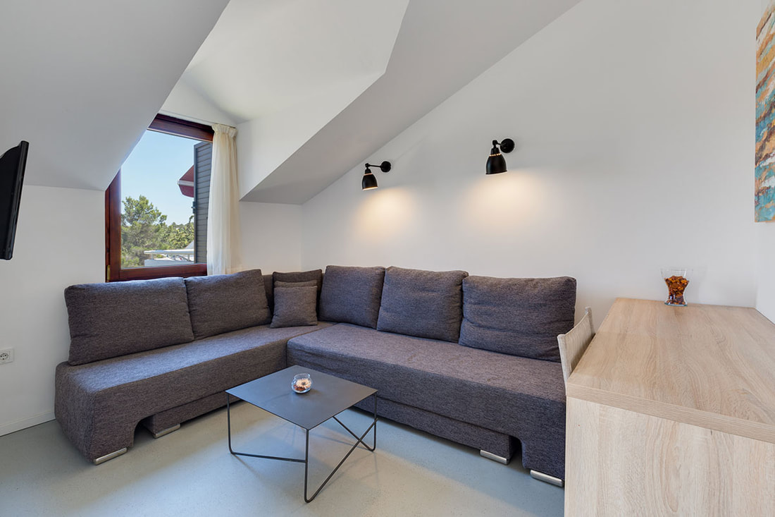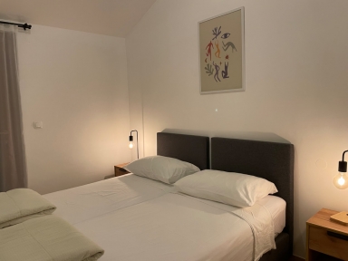 APP 2+1 (tip A): prib. 30 m2, dnevni prostor s tremi ležišči, kuhinjska niša z jedilnim kotom, kopalnica (prha/WC) balkon ali terasa. Delno obnovljeni 2023. Največ 2 odrasla in 1otrok do 12 let.