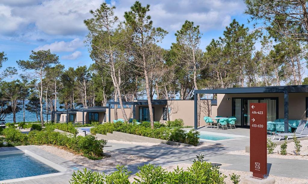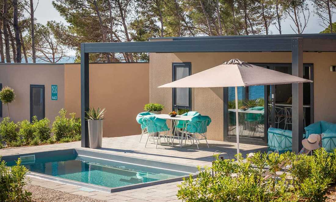1/4+2 MH LUX POOL AC / Luxury Holiday home with pool: prib. 40 m2, spalnici (ena z zakonsko posteljo, druga z ločenima ležiščema), kuhinja in dnevni prostor z raztegljivim kavčem, 2 kopalnici (prha/WC). Največ 4 odrasli in 2 otroka do 12 let. Lokacija: 2. do 5. vrsta do morja z zasebnim bazenom.