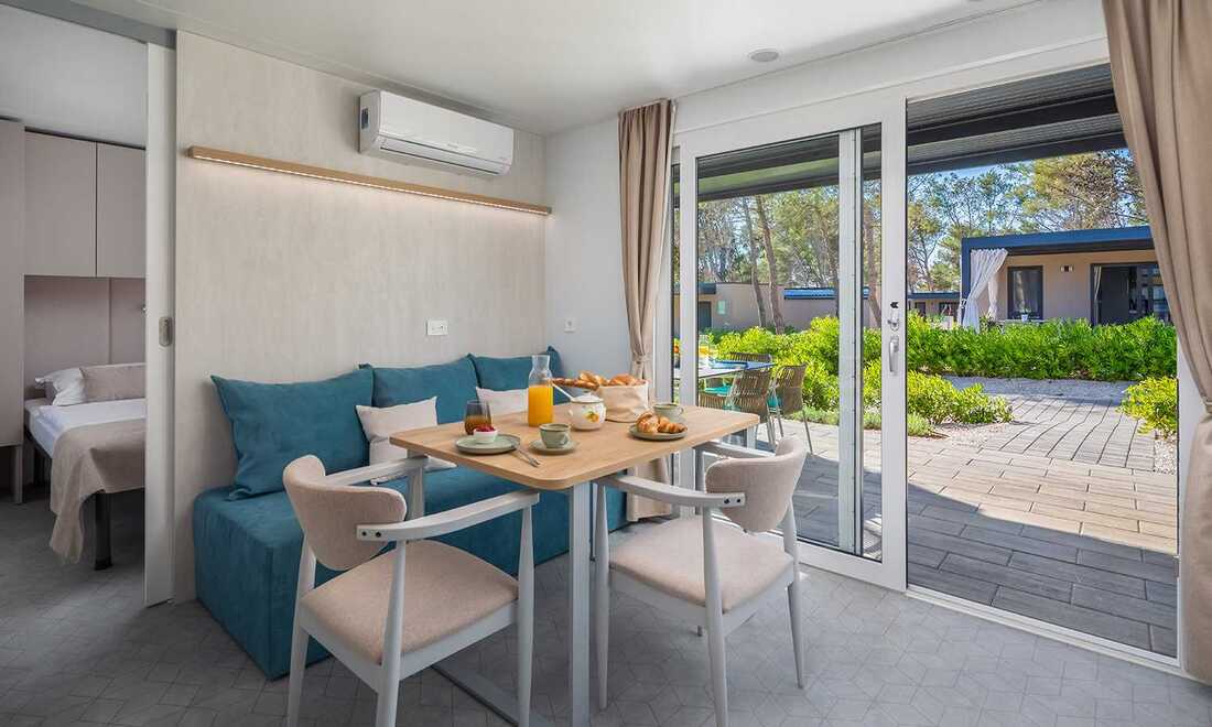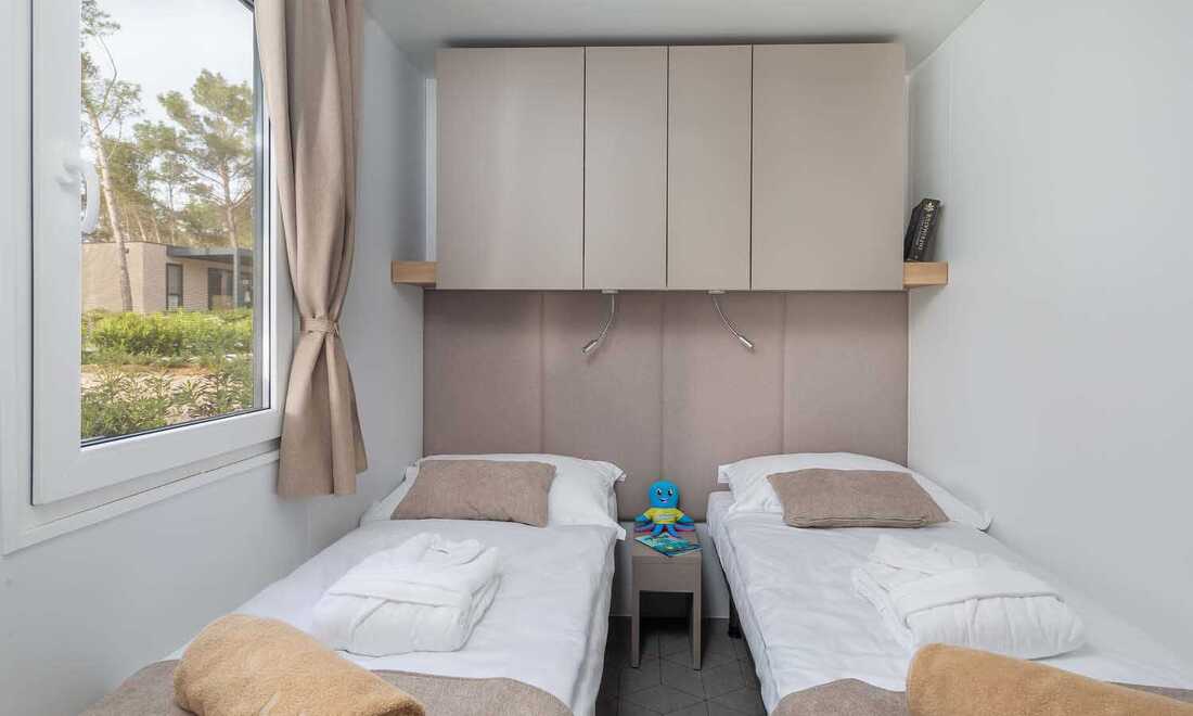 1/6+1 MH FAM PRM AC / Family Premium Holiday home: prib. 33 m2, 3 spalnice (ena z zakonsko posteljo, drugi dve z ločenima ležiščema), kuhinja in dnevni prostor z raztegljivim kavčem, 2 kopalnici (prha/WC). Največ 6 odraslih in 1 otrok do 12 let.