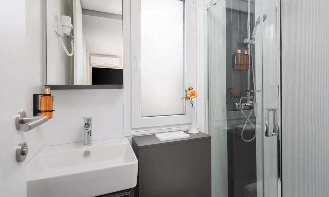 1/4+2 MH PRM AC / Premium Holiday home: prib. 33 m2, 2 spalnici (ena z zakonsko posteljo, druga z ločenima ležiščema), kuhinja in dnevni prostor z raztegljivim kavčem, 2 kopalnici (prha/WC). Največ 4 odrasli in 2 otroka do 12 let.