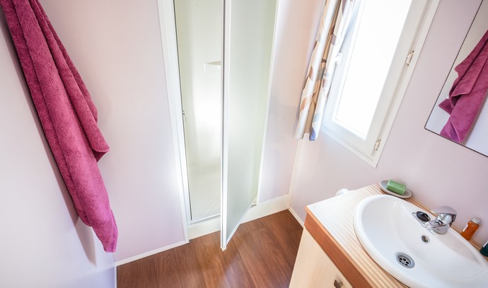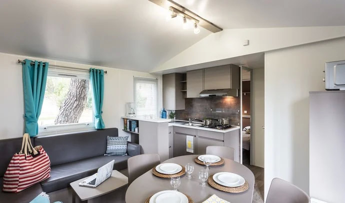 MH 4+2 Comfort B: prib. 32 m2; 3 spalnice (ena z zakonsko posteljo, drugi dve z ločenimi ležišči), dnevni prostor in kuhinjska niša, 1 kopalnica (prha/WC), dodatni WC, popolnoma pokrita terasa 18 m2 opremljena z mizo, stoli in 2 ležalnikoma. Največ 4 odrasli in 2 otroka do 12 let. Nahajajo se v coni K, od morja 250-300 m.