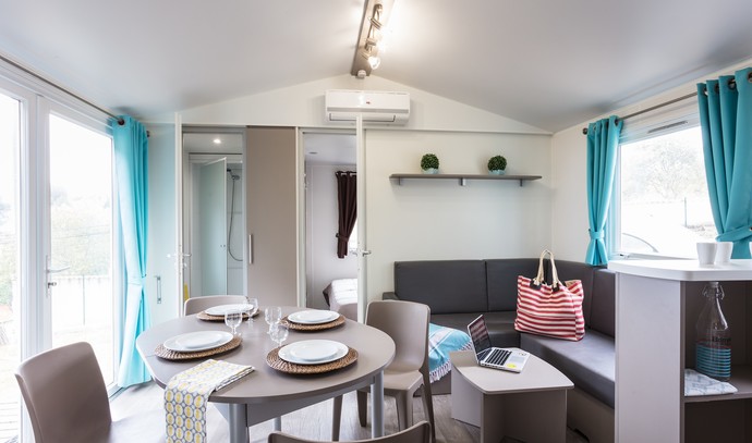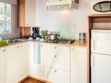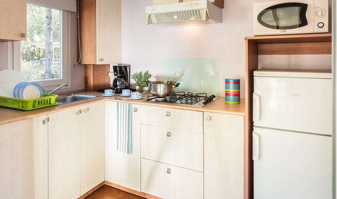 MOBILNE HIŠICE (B): oprema vseh hišic: klima, SAT TV, mikrovalovna pečica, hladilnik z zamrzovalnim delom, aparat za kavo, žar na oglje, komarniki na oknih.