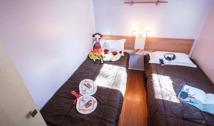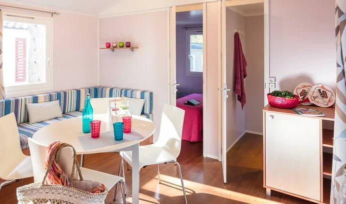 MH 1/4+2 CLASSIC AC (3AIB): prib. 25 m2 + terasa 12 m2, 2 spalnici (ena s francosko posteljo, druga z ločenima ležiščema), dnevni prostor z zofo (160x110 cm), kuhinjska niša, kopalnica (prha/WC). Največ 4 odrasli in 2 otroka do 15 let.