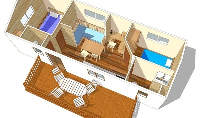MH 1/6 COMFORT AC (3HOB): 32 m2 + terasa 15 m2, 3 spalnice (ena s francosko posteljo, dve z ločenima ležiščema), dnevni prostor s kuhinjsko nišo, kopalnica (prha/WC).