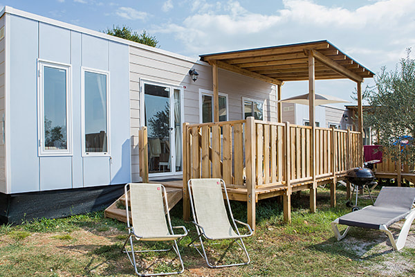 MOBILNE HIŠICE (H): vse imajo klimo, mikrovalovno pečico, aparat za kavo in pokrito teraso s sedežno garnituro. Od morja oddaljene prib. 350 m.