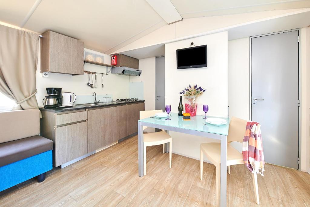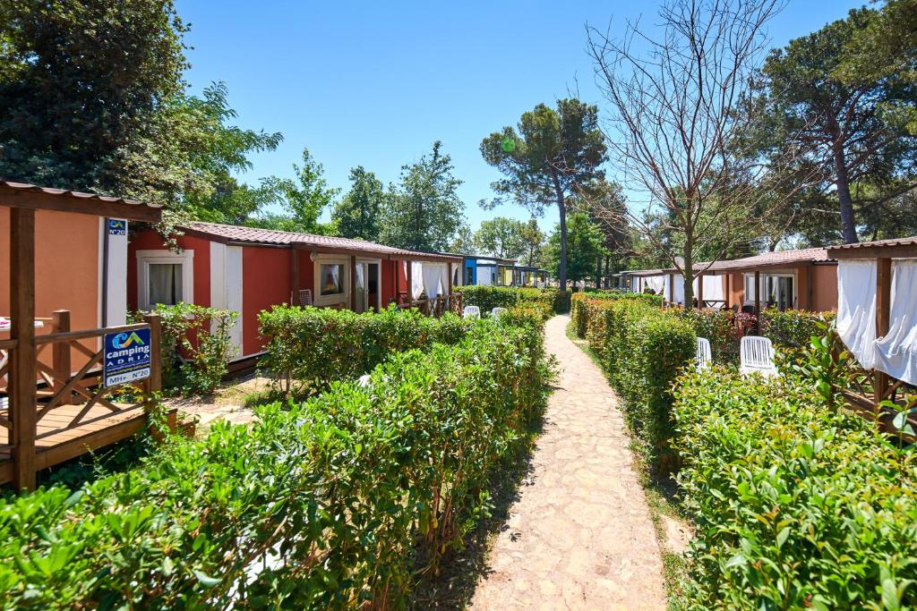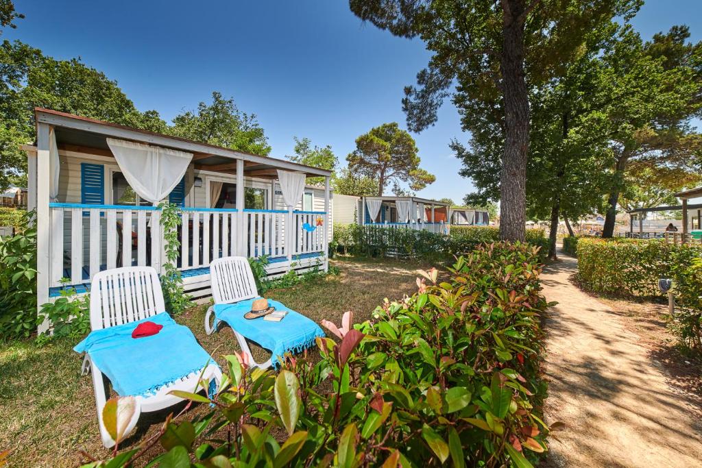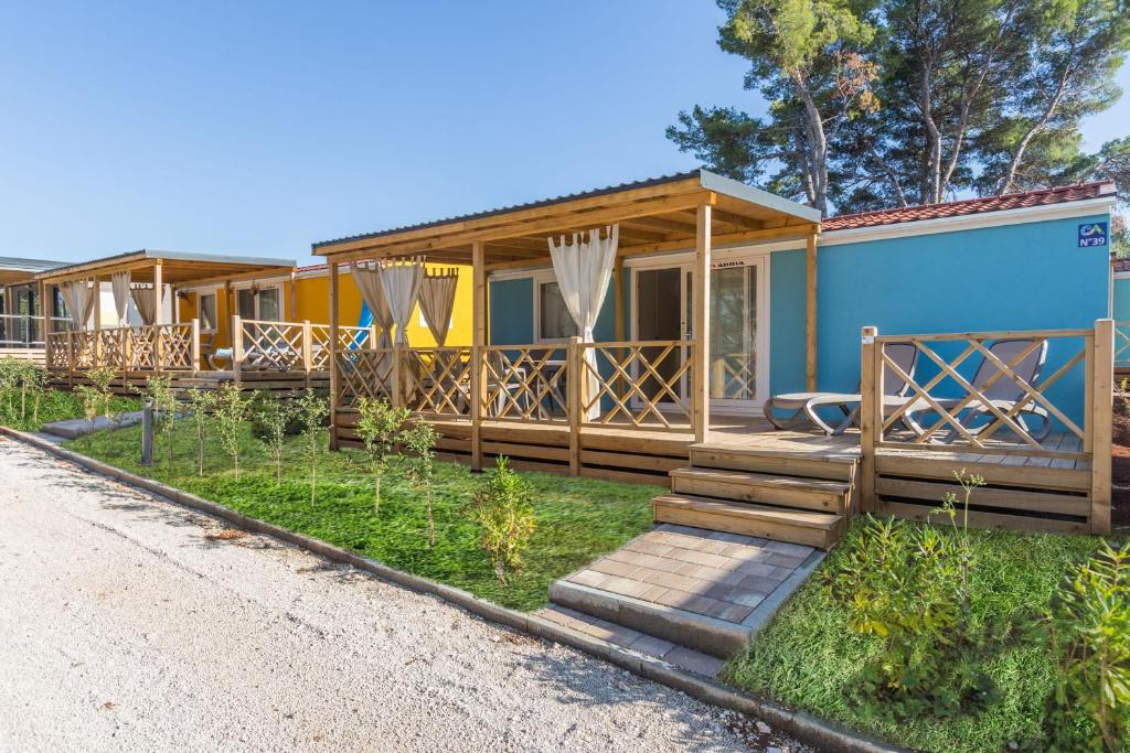 MOBILNE HIŠICE (V): opremljene s klimo, aparatom za kavo, mikrovalovno pečico, SAT TV. Pokrita terasa s sedežno garnituro, parkirišče. Od morja oddaljene 200-500 m.