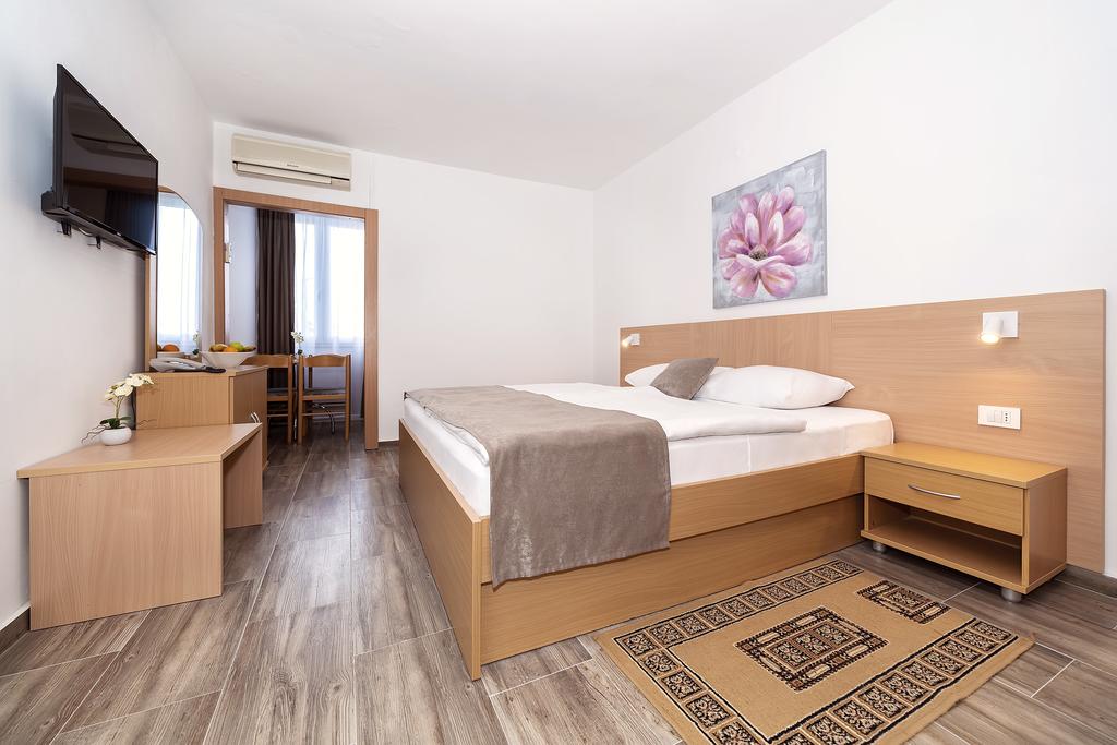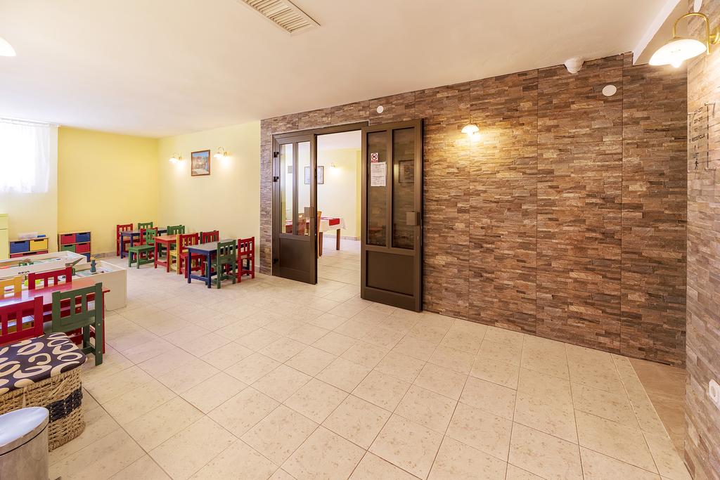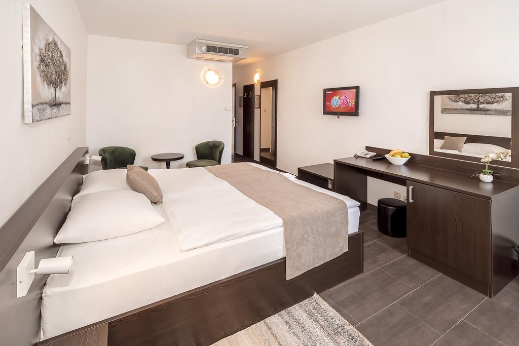 SOBE: 85 prenovljenih sob; klima, TV, mini hladilnik, sušilnik za lase, kopalnica (prha/WC). Dvoposteljne brez možnosti dodatnega ležišče. Družinske sobe v velikosti prib. 27 m2 imajo francosko posteljo in pograd (191×90 cm), ki je v manjšem, brez vrat ločenem prostoru. Otroška posteljica brezplačno za otroka do 2 let, potrebna predhodna najava.