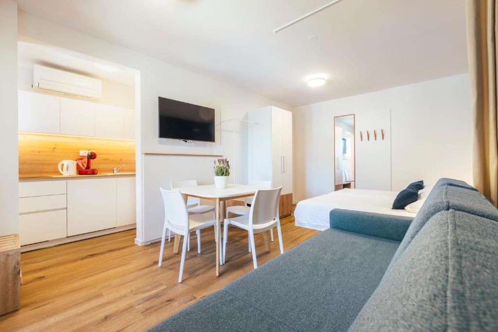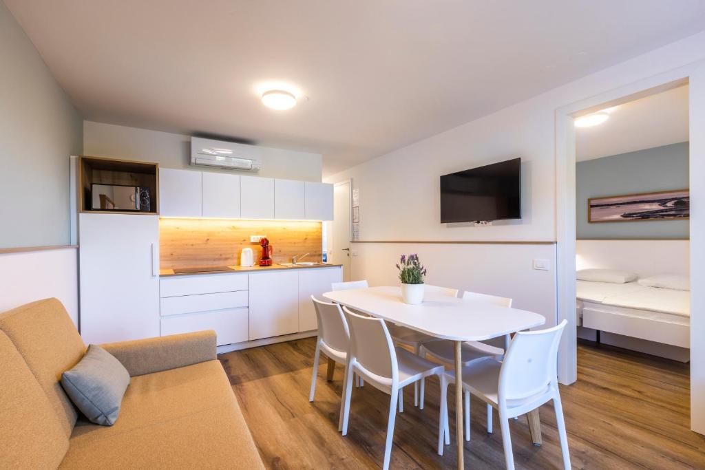 Apartmaji so bili leta 2022 prenovljeni. Nahajajo na hribčku s pogledom na Strunjanski zaliv. Vsi apartmaji vključujejo opremljen balkon ali teraso, opremljeno majhno kuhinjo z jedilnico. Uporabljate lahko vse storitve v resortu Salinera, kot so zunanji in notranji bazen, restavracijo in otroško igrišče.