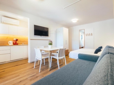 STUDIO 2+2 – prenovljeni (pribl. 28 m2): kuhinjska niša (indukcijska kuhalna plošča, mikrovalovna pečica, hladilnik z zamrzovalnim delom, pomivalni stroj, aparat za kavo, grelnik za vodo), dnevni prostor (zakonska postelja in raztegljiv kavč; postelja je od dnevnega prostora optično ločena z zaveso), klima, kopalnica (prha, WC, sušilec za lase), SAT TV, balkon ali terasa.