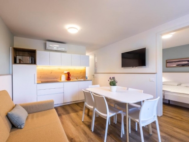APP 4+2 – prenovljeni (pribl. 42 m2): kuhinjska niša (indukcijska kuhalna plošča, mikrovalovna pečica, hladilnik z zamrzovalnim delom, pomivalni stroj, aparat za kavo, grelnik za vodo), dnevni prostor z raztegljivim kavčem, dve spalnici (ena z zakonsko posteljo, druga z dvema ločenima ležiščema), klima, kopalnica (prha, WC, sušilec za lase), SAT TV, telefon, balkon ali terasa.