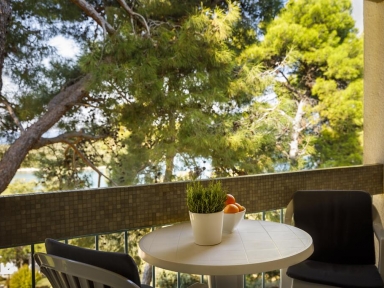 PLAŽA: 100 m, skalnata, na delu plaže nasut droben pesek. Možnost najema sončnikov in ležalnikov.